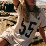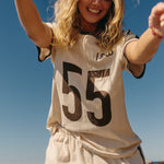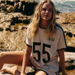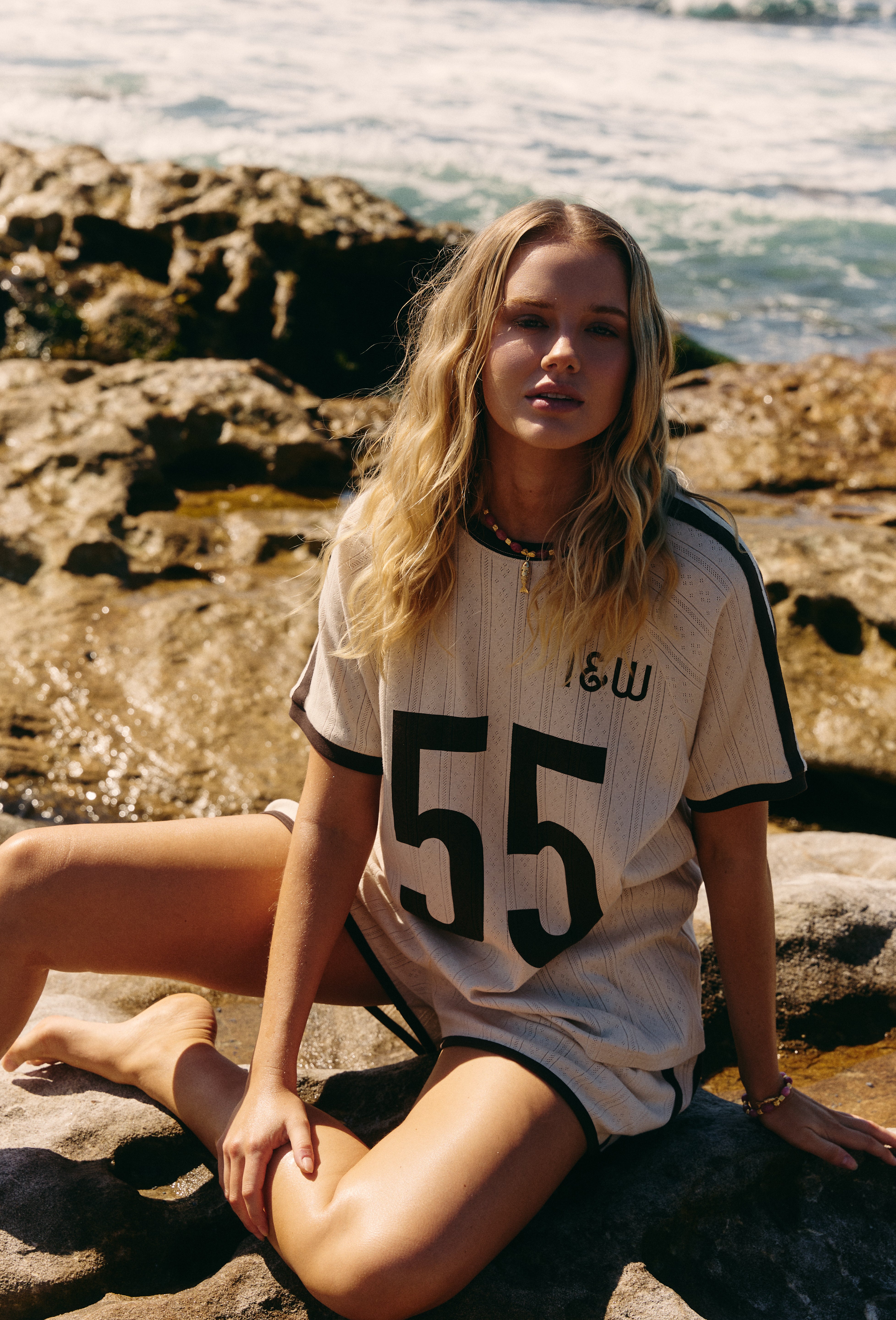 The Club 55 Tee is crafted from organic cotton pointelle — a lightweight, breathable fabric with subtle texture that moves beautifully with the body. It features the signature “55” motif and contrast trim, finished in soft oat with deep cocoa tones.