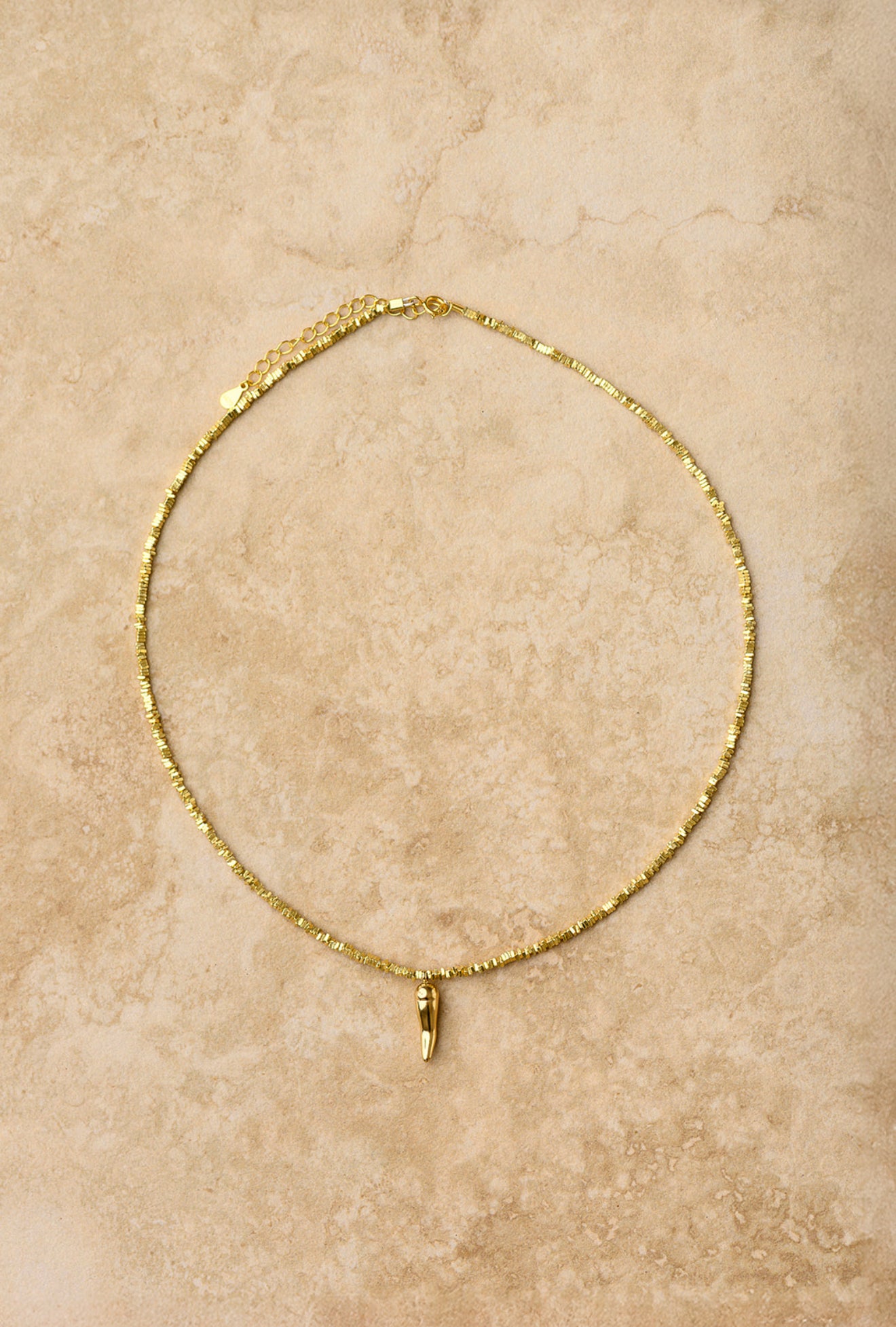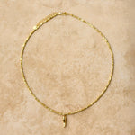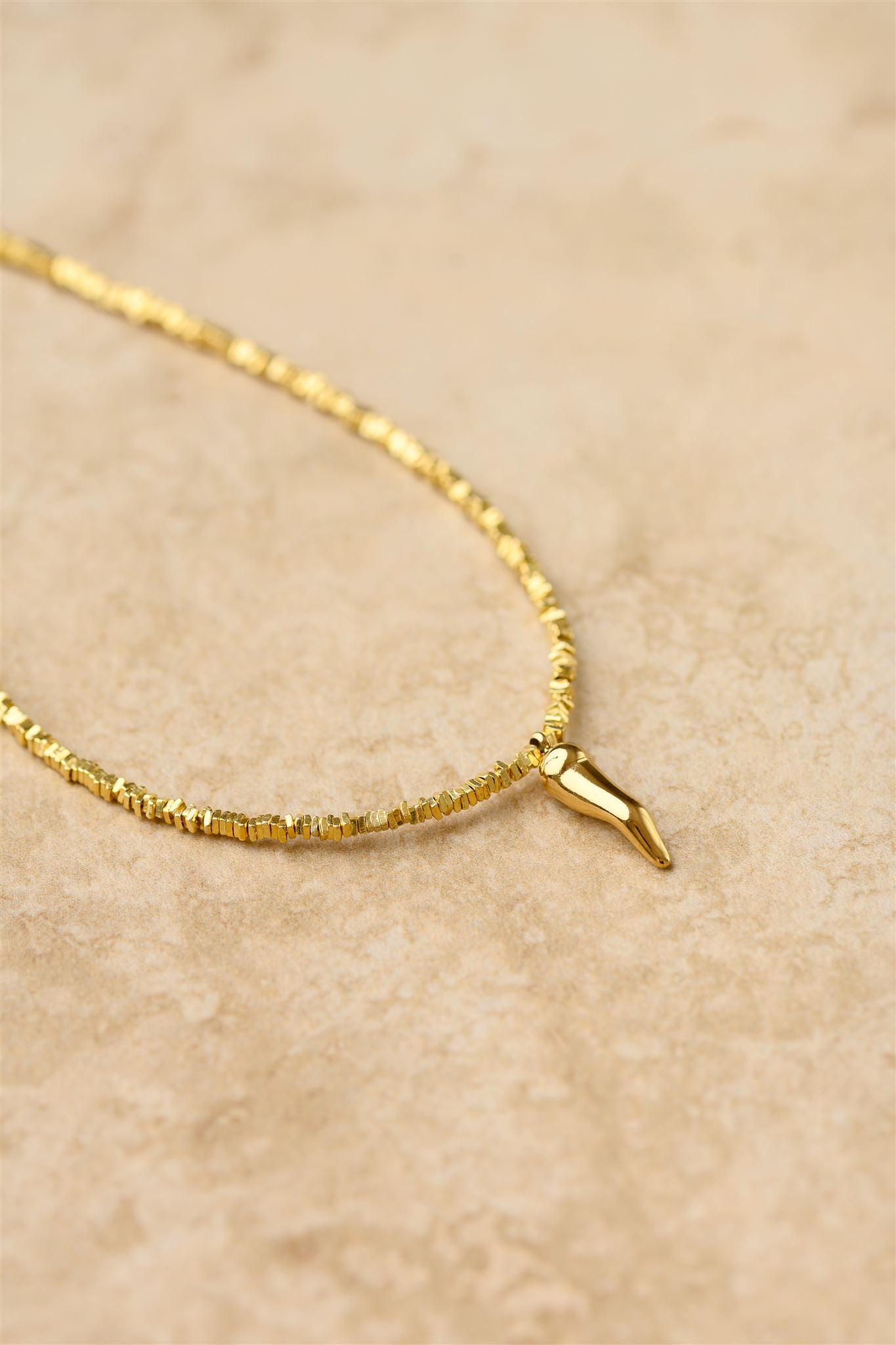 Add some spice to your look with this Cornicello Necklace! Featuring a chilli charm on a crushed gold thin chain, this necklace is perfect for adding a touch of playfulness to any outfit. Don't miss out on this quirky and unique accessory!