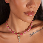 Invite joy and gentle energy with our GOIA Necklace. Designed with natural pink jade stones, a charming sardine pendant, and 18Kt crushed gold filled beads, this piece blends coastal playfulness with elegant femininity.