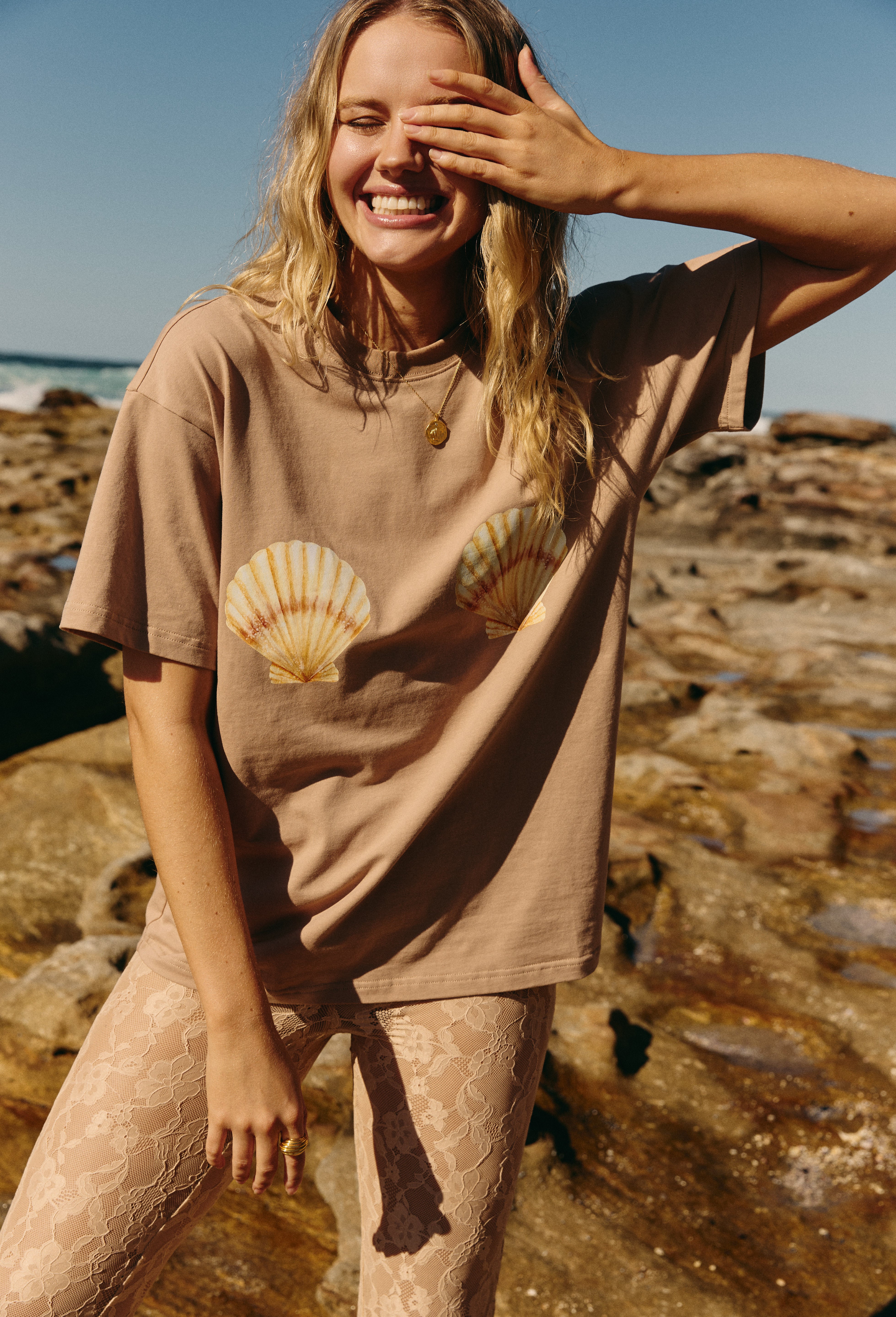 Introducing the Shelby Tee - the perfect tee for beach lovers! Made from organic cotton, this seashell-inspired top is not only stylish but also environmentally friendly. Put it on and feel the ocean vibes wherever you go.