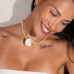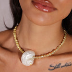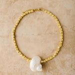 Where luxury meets the sea. The THALASSA Necklace is a refined statement of coastal elegance, featuring 18kt crushed gold filled beads and a striking natural conch shell. Sculptural, radiant, and deeply grounding — this piece evokes the essence of the ocean in its most elevated form.