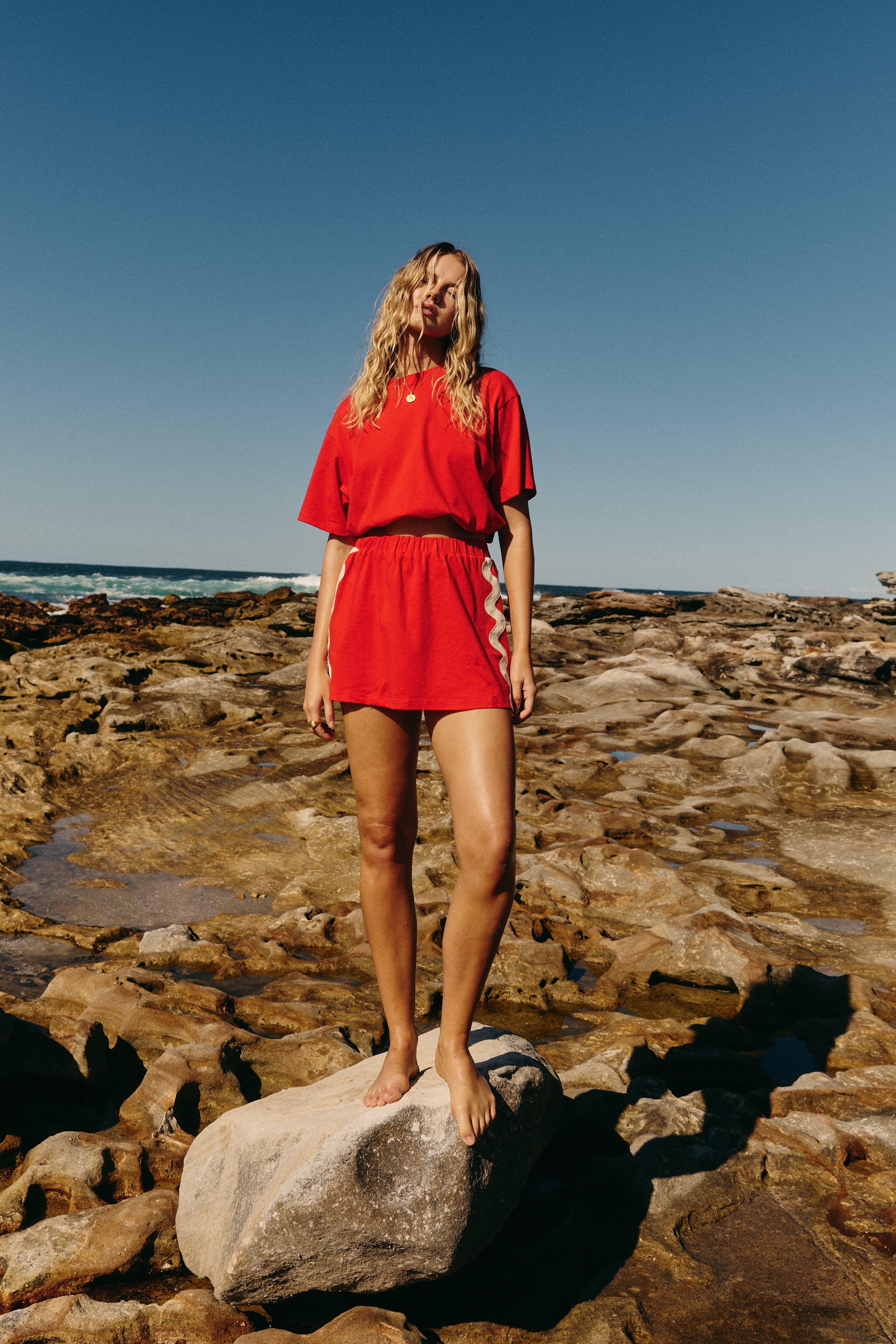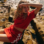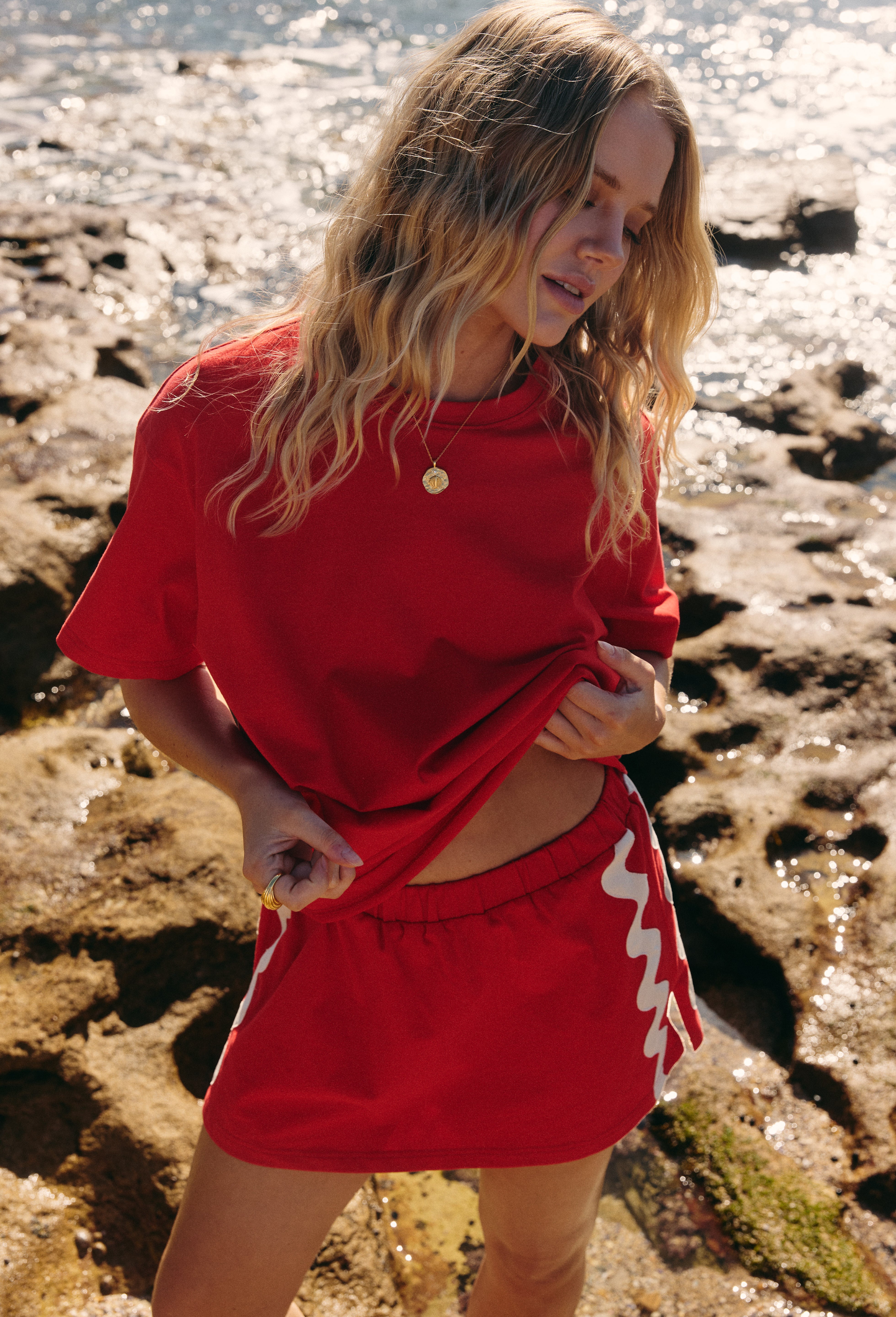 The Sol Run Skirt is crafted from organic cotton hemp in a vivid, sun-washed red — striking yet timeless. With an easy elastic waistband and signature wave detailing along the sides, it’s designed for comfort and freedom of movement.